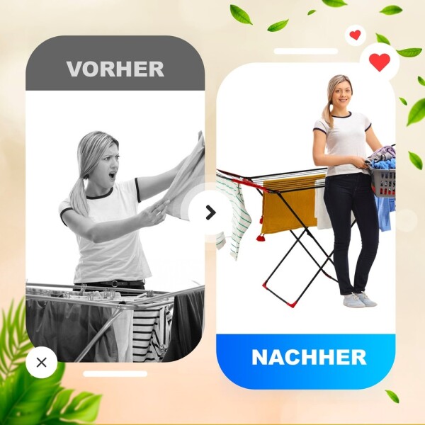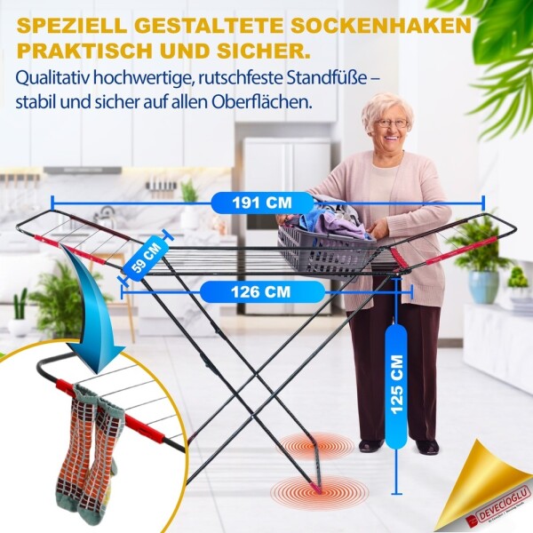 20 Meter Trockenfläche: Mit 20 Metern Trockenfläche bietet der Wäscheständer reichlich Platz zum Aufhängen von Wäsche. Spezielle Halterungen für Socken und kleine Wäschestücke sind ebenfalls vorhanden.