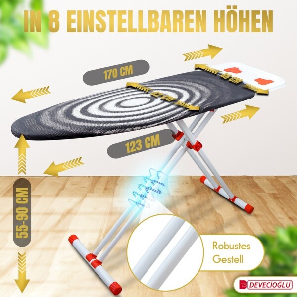 Bügelbrett, Bügeleisen Ablage, Bügelbrettbezug 43x123cm, Höhe 55-90cm, Grau