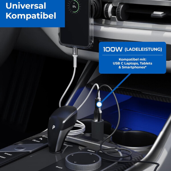 prio Fast Charge Car Charger 100W PD (USB C) + 22.5W (USB A) black