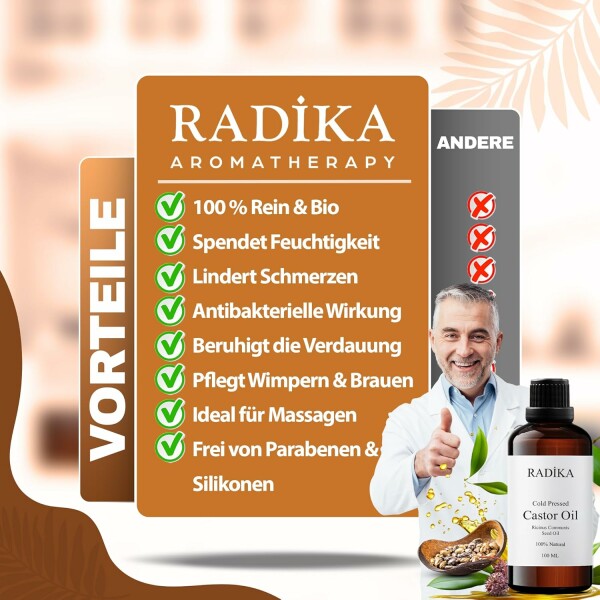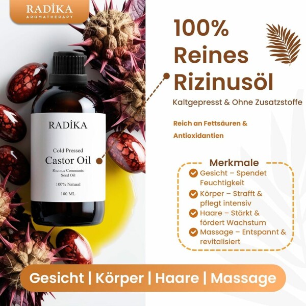 Rizinusöl ist ein sehr nützliches Öl für Augenbrauen, Wimpern und Haare. Es reduziert den Haarausfall und stärkt das Haar. Darüber hinaus hat es auch eine glanzsteigernde Wirkung auf das Haar. Bei Muskelschmerzen können Massagen mit Rizinusöl zur Schmerzlinderung beitragen. Es sorgt für eine schnellere Heilung von Wunden, unterstützt aber auch die Beseitigung von Infektionen. Es hilft, die Bildung von Pilzen zu verhindern. Es hilft bei der Entfernung von Akneflecken, die bereits auf der Haut entstanden sind. Es kann als natürlicher Feuchtigkeitsspender auf der Haut oder zur Beseitigung von Rissen in den Fersen der Füße verwendet werden. Unterstützt die Heilung von Akne. Es macht die Lippen weich und polstert sie gleichzeitig auf.