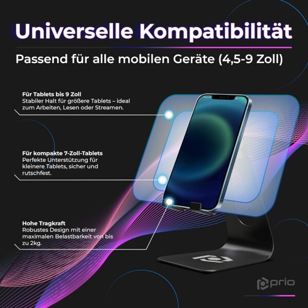 Funziona con tutti i dispositivi mobili con una dimensione fino a 9 pollici e un peso di 2 kg. Appoggia il telefono o il tablet in posizione verticale o orizzontale mantenendo il pieno accesso a tutte le sue funzioni.