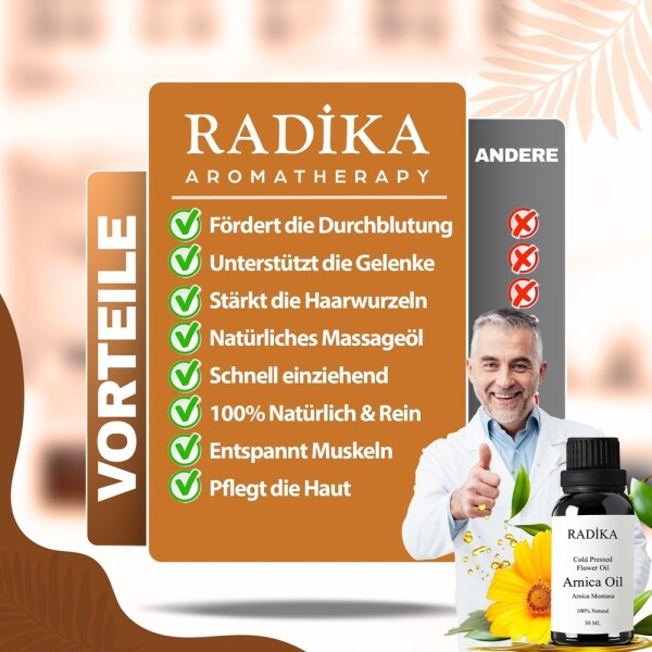 Arnika-Öl, das in der geleneksel Medizin verwendet wird, hilft, Gelenkbeulen, Prellungen, Arthritisschmerzen ve Muskelzerrungen zu lindern. Arnika, Gelenken ve Muskeln'in yoğun spor bahisleri veya antrenmanları için ideal masajlardan biridir. Bu, Haut'a bir fayda sağlayan bir Wirkung'dur. Regelmäßige Massagen der Kopfhaut mit Arnikaöl ve uyarıcılar ile Haarfollikel, böylece yeni ve daha iyi hareketler yapılabilir.